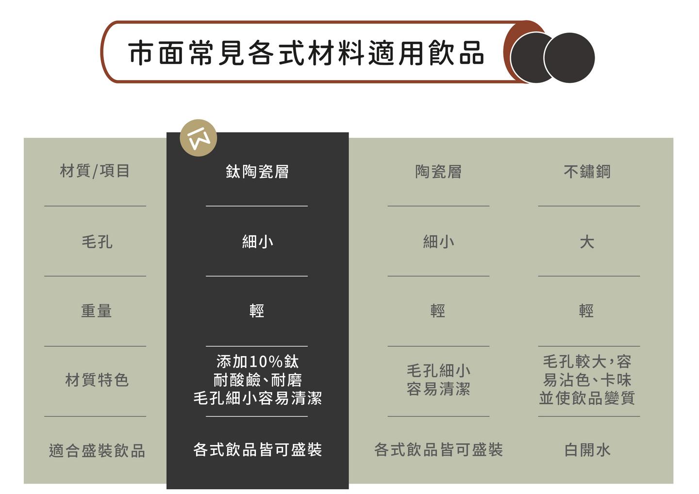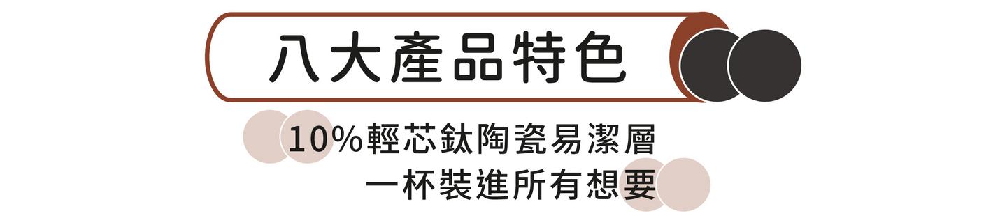 獨家研發鈦陶瓷易潔層,在陶瓷塗料中加入 10% 的鈦成分,經由 300 度高溫燒結,毛孔細小不容易沾色、卡味,使用後更好清洗,可裝進果汁、茶飲、咖啡、優格、氣泡飲等多種飲品,每次進口,盡享原味。