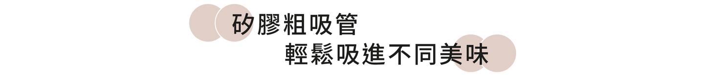 採用嬰兒奶嘴同等級矽膠,設計能吸珍珠的粗矽膠吸管,經由開發團隊測試數種飲料店配料,從珍珠、粉條、椰果到果粒,古溜古溜,輕鬆吸進各種美味。
