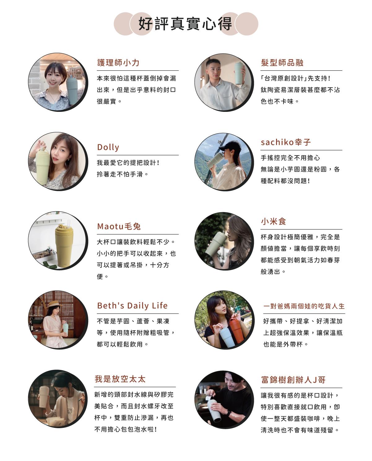 由台灣手搖文化出發設計,有感升級開發 770ml 大容量,結合獨家鈦陶瓷、封水結構、珍珠粗吸管、隱藏式手提及可替換止水豆設計,寬大口徑,不僅不沾色、不卡味,更好清潔,專為手搖控準備,一杯就足夠日常所需!