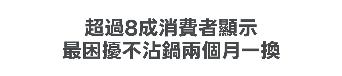 追求的當然遠不只安全。超過 8 成消費者表示,不沾鍋最令人詬病的就是汰換頻次太高,丟鍋丟到心會痛。