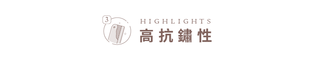 複合鋼夾鋼技術,將高硬度的高碳高鉻鋼作為鋼芯,並用 430 食用級不鏽鋼作為刀面,適應台灣潮濕氣候,除了鋒利防鏽兼顧外,內硬外軟的特性,讓整把刀的韌性提升。