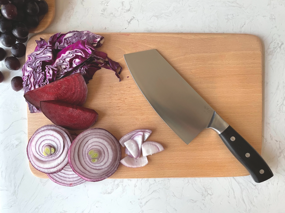 非常適合切割較厚的食材,例如高麗菜、白蘿蔔、大型原塊肉品等,切割時可以用另一隻手從刀背下壓輔助,利用刀面寬度來增加切割深度。