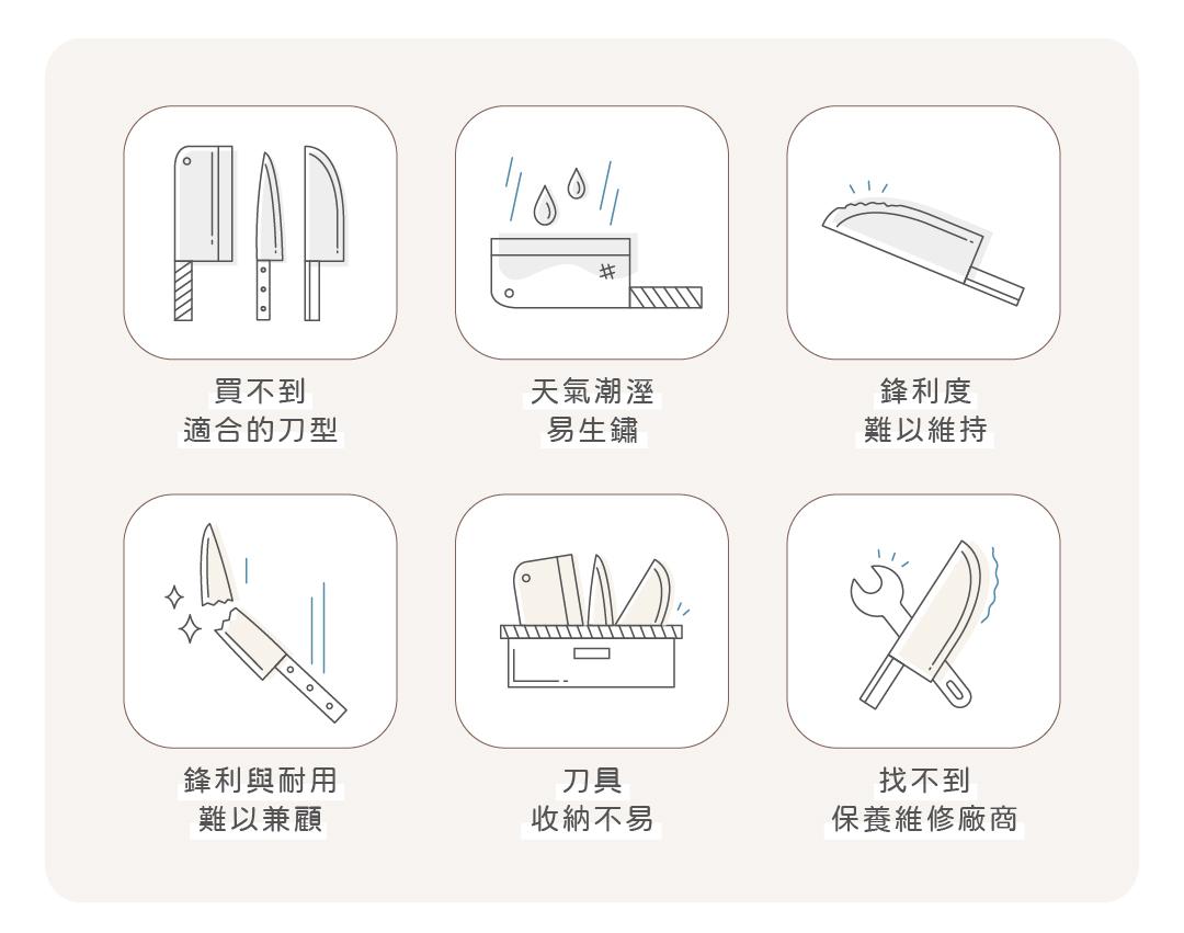 台灣有自己特殊的飲食習慣與料理文化,也進而發展出台灣獨特的刀型,是進口刀具常常難以取代的,但傳統刀具的手感與設計,已經不符合現代人的習慣與喜好。