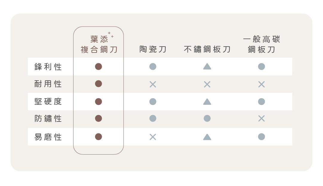 採用高硬度的「高碳高鉻鋼芯」製成,硬度高達 HRC58;加上「手工開刃」的技術,刃角介於15-17 度,使得葉添的刀具有良好的鋒利度。