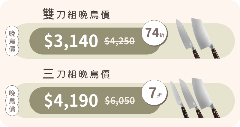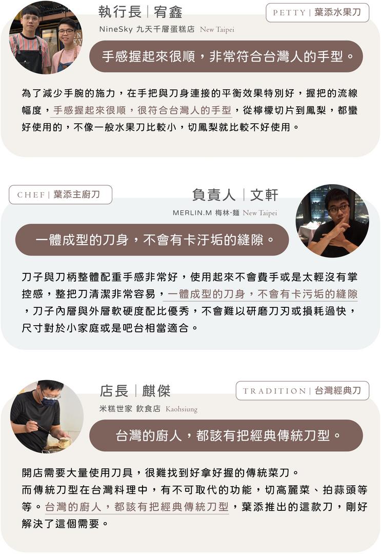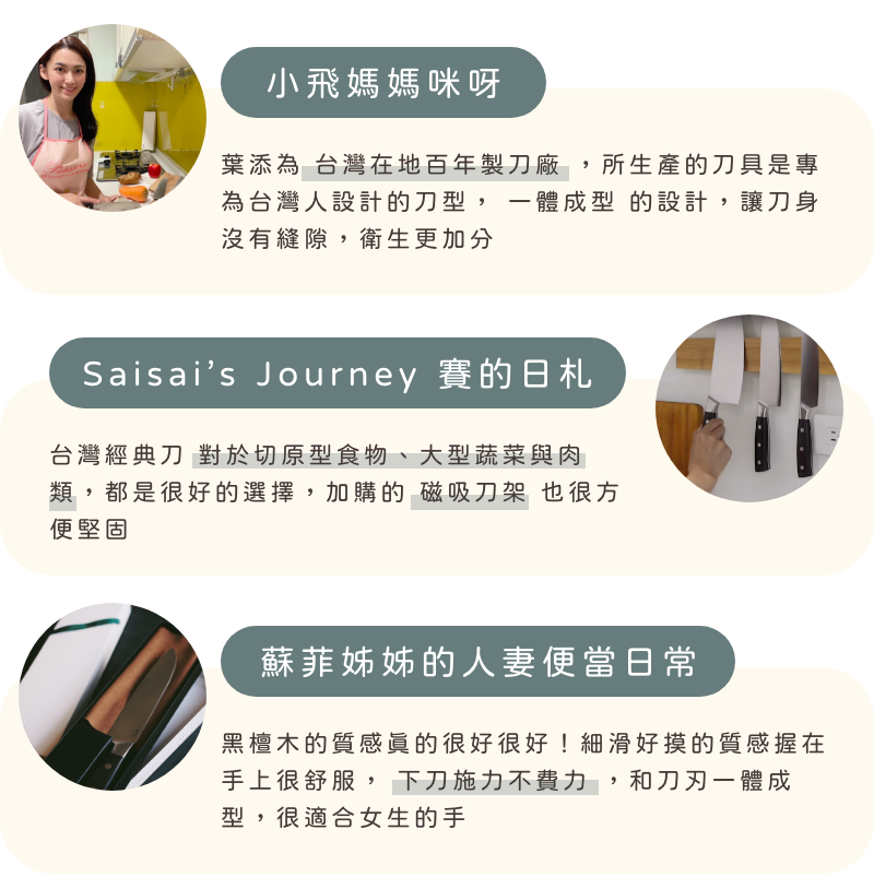 加長型水果刀、萬用主廚刀、台灣經典刀,