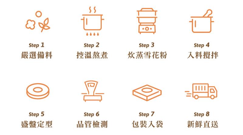 一斤糯米僅能磨製出原重量 60% 的糯米粉,細緻的雪花細粉,為福貴糕口感彈牙的關鍵。可常溫食用,無需烹調,每口吃得到滿滿用料,口齒留香!