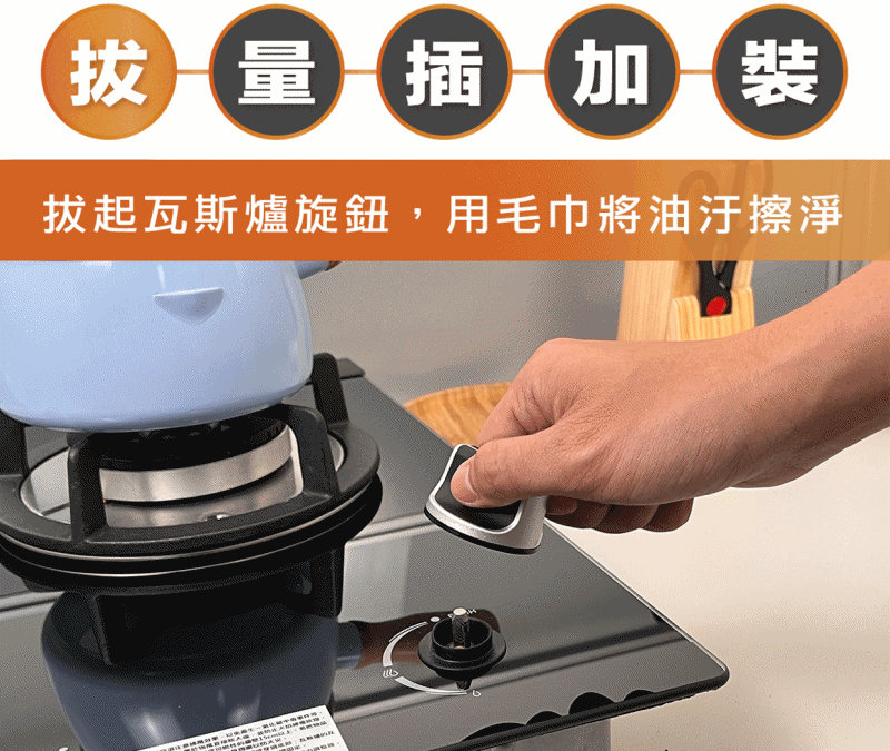 拔:拔起瓦斯爐旋鈕,用毛巾將油汙擦淨